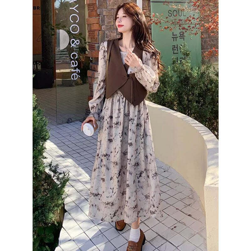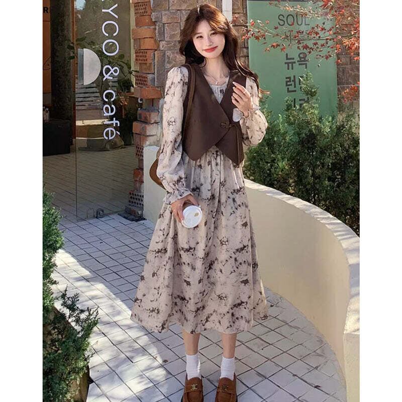 ブラウンベスト×Aラインギャザーワンピース