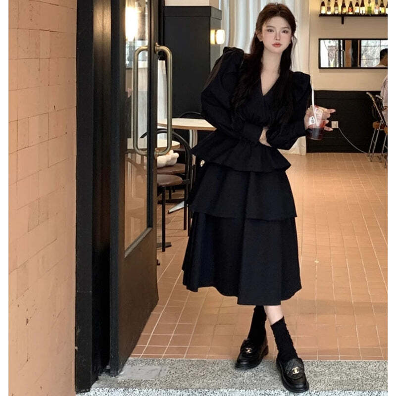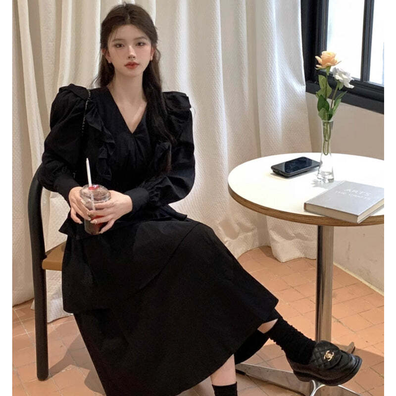 Vネックブラックフリルワンピース