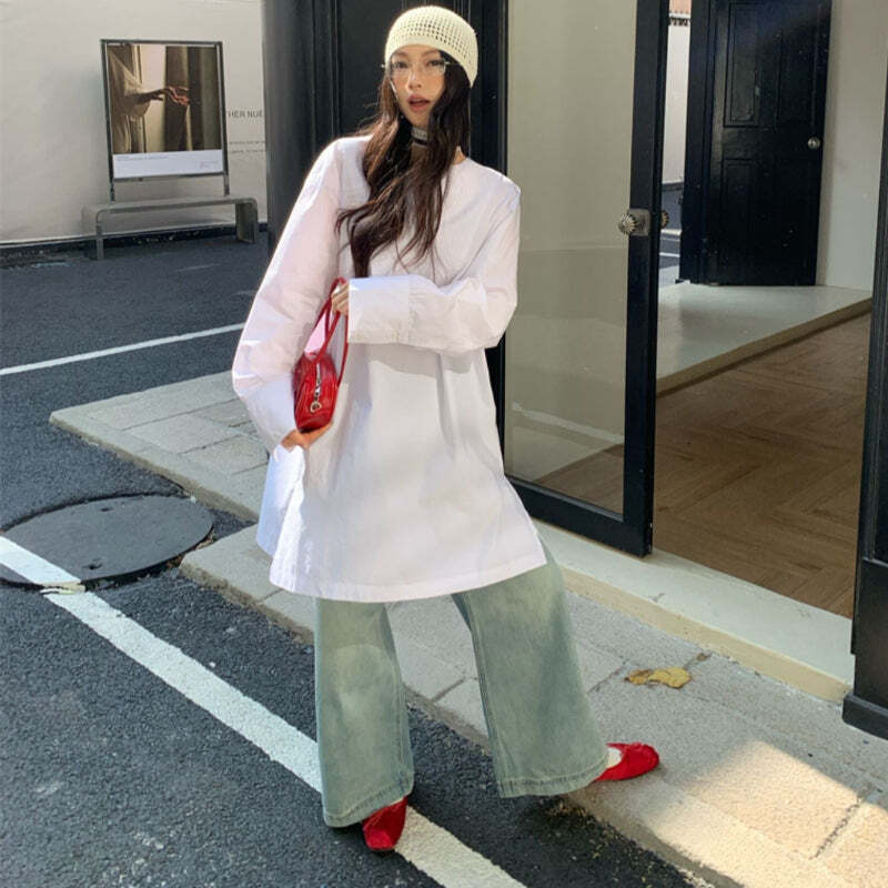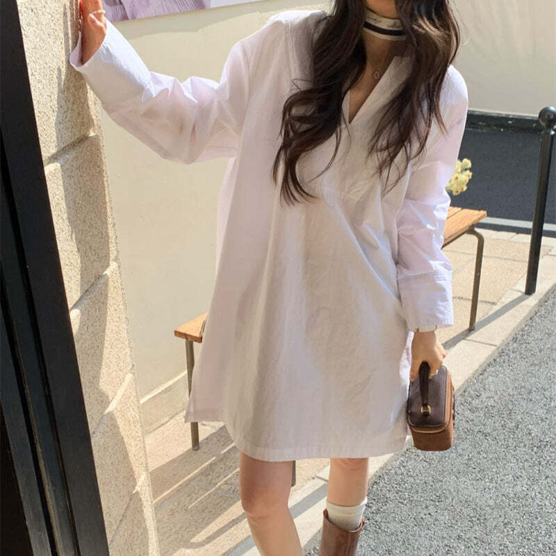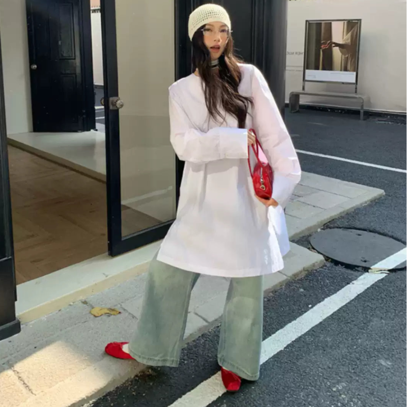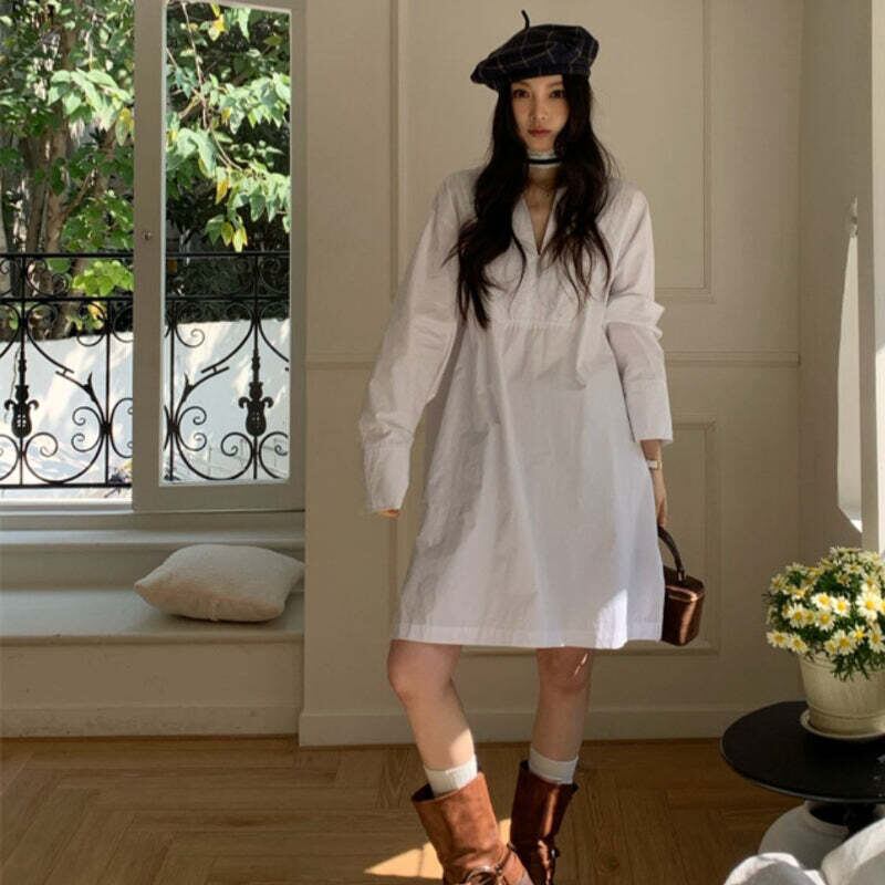 シンプルなのに洗練された印象のホワイトシャツワンピース。