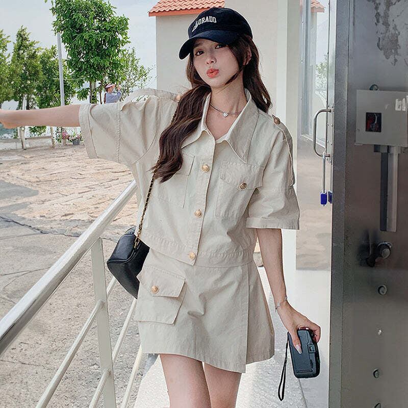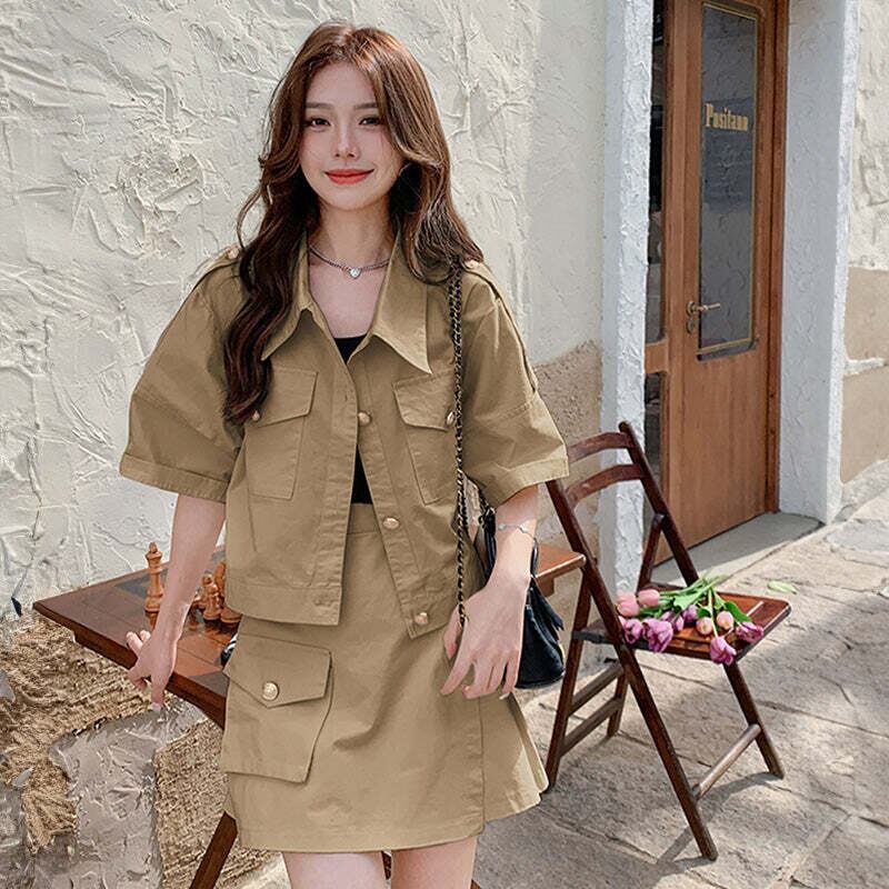 ミリタリーテイスト×ガーリーなMIXセットアップ/クロップドジャケット&台形スカートセット