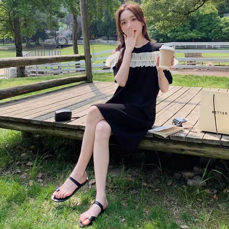胸元のアイボリー配色フリルが、ブラックとのコントラストで映え感抜群。