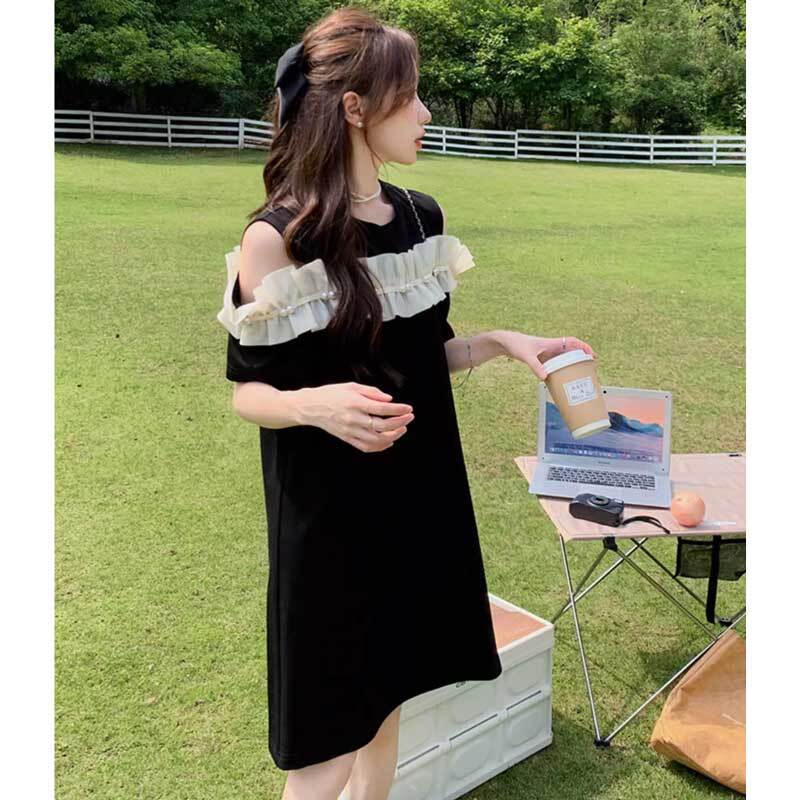 大人フェミニンな肩あきフリルワンピース/ブラック×アイボリー