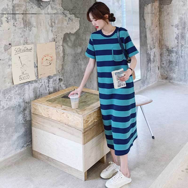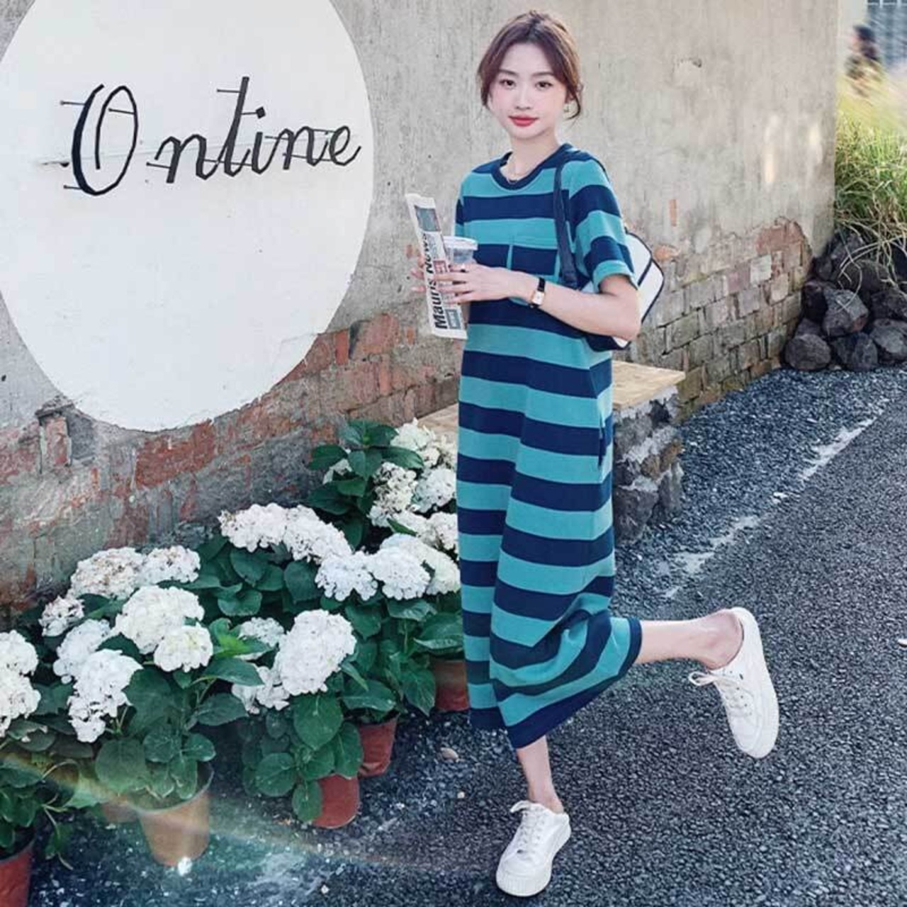 ネイビー×ブルーグリーンの太ボーダーが目を引くカットソーワンピース。