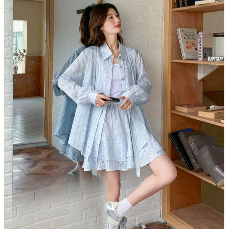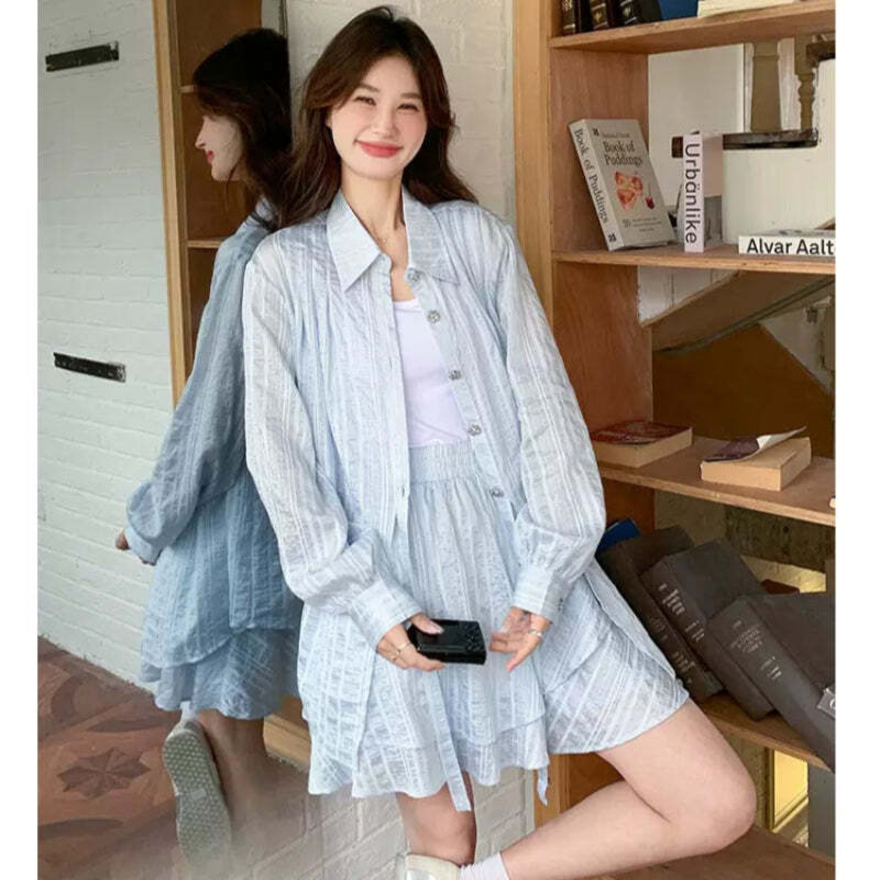 透明感のある軽やかな生地が魅力のシアーシャツ&スカート風ワンピース。