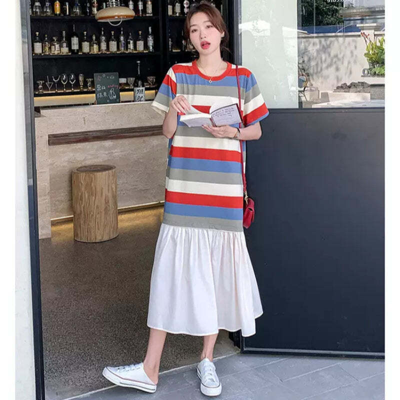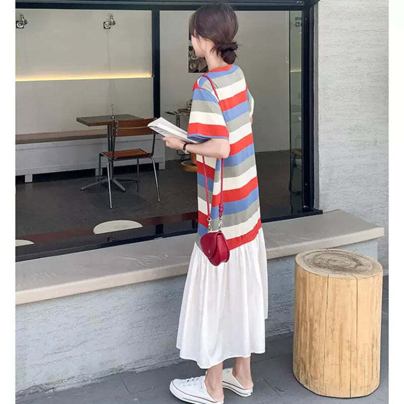 カジュアルなボーダートップス風デザインに、フェミニンな白フレアスカートをドッキングした1枚で着映えするワンピース。