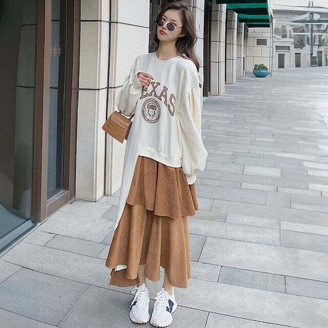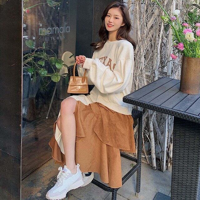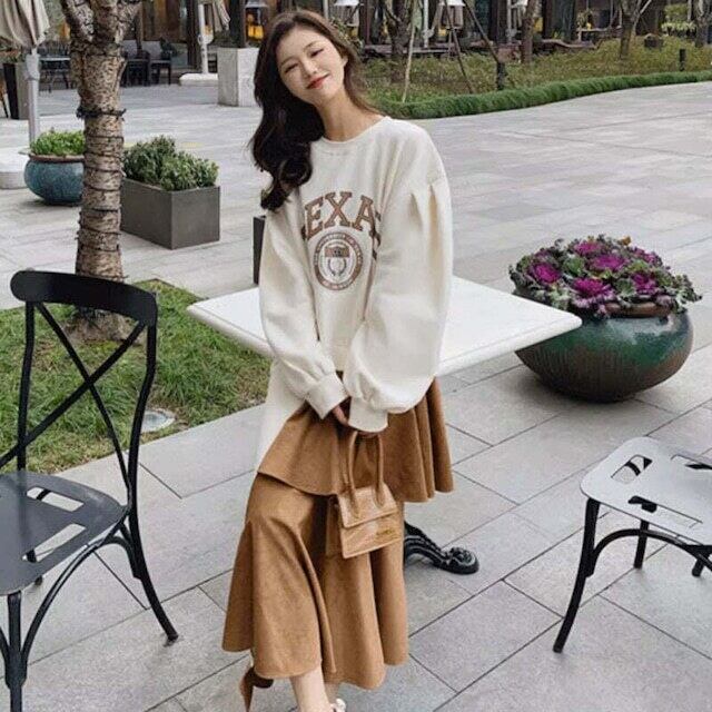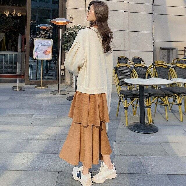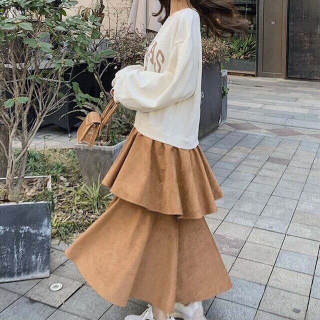 袖は身頃にタックが入り、スカートは秋を感じさせるスエード素材。