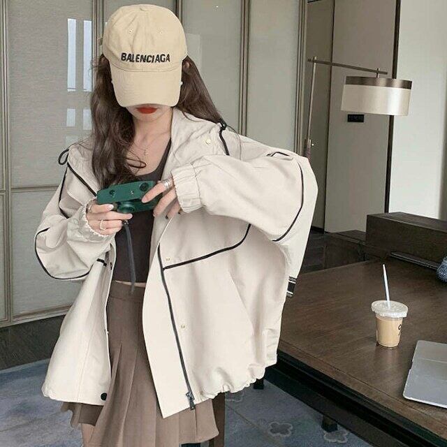ハイネックフードと裾のドローストリング
