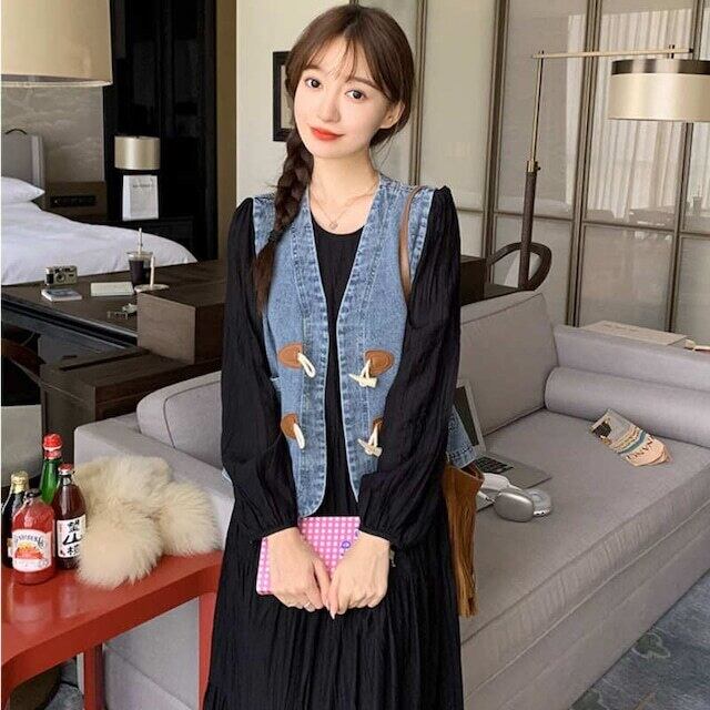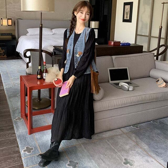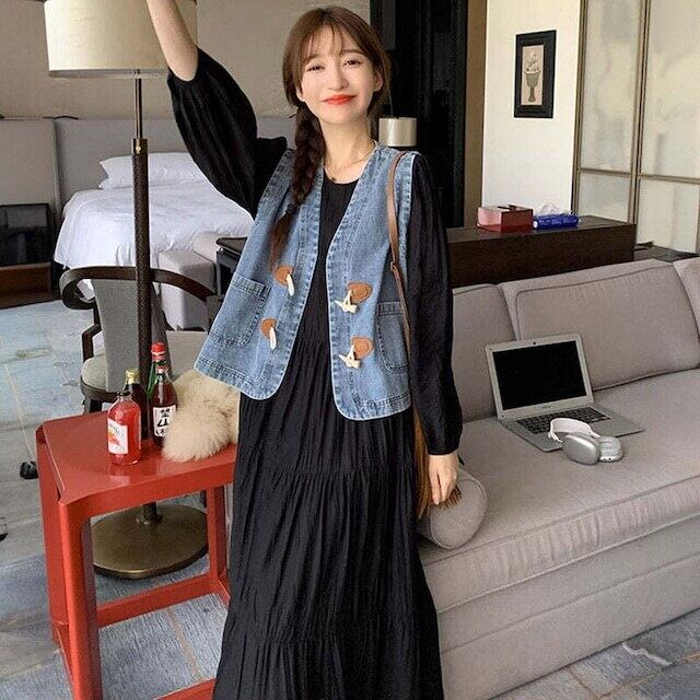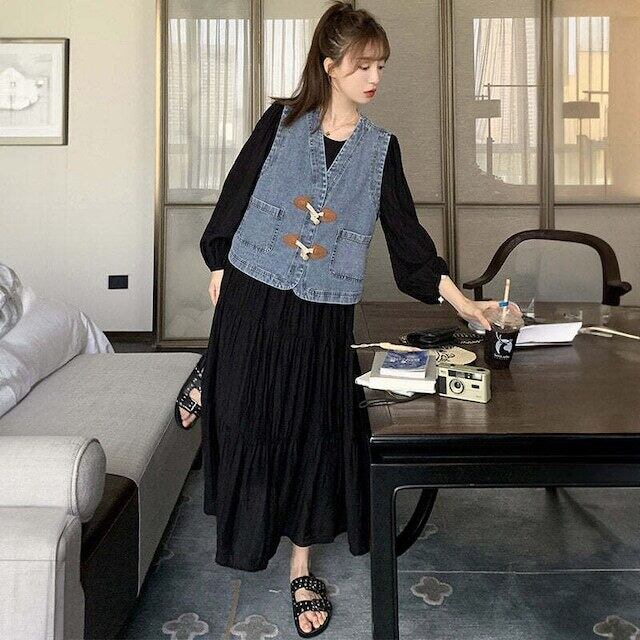 デニムトグルボタンベスト×ティアードマキシワンピース