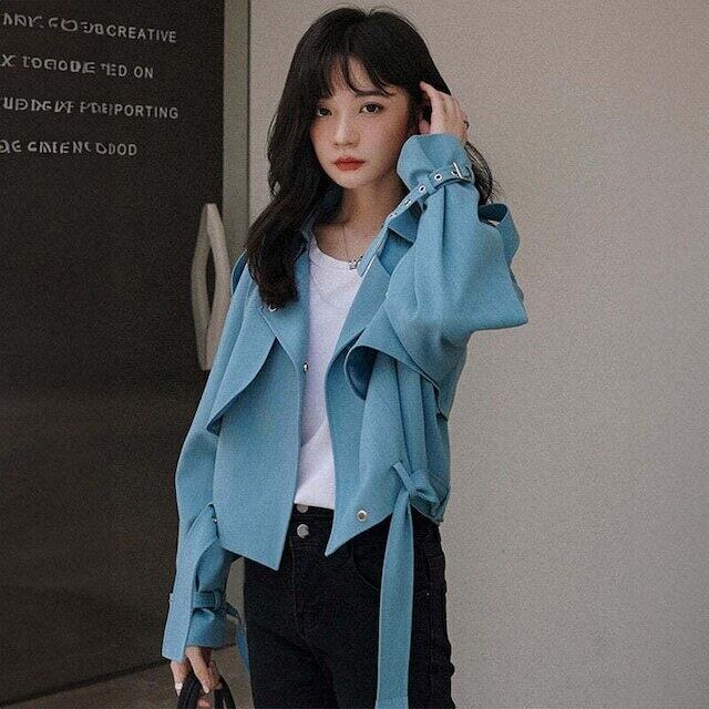 くすんだブルーのショートトレンチコート。