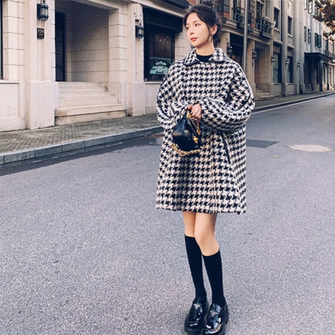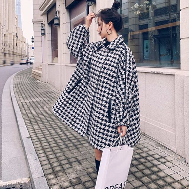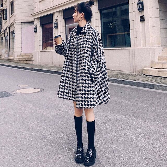 モノトーンの千鳥格子柄がエレガントなミディコート。