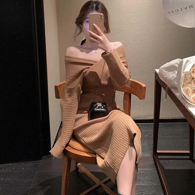 大きく開いたデコルテラインが大人の肌見せスタイルを演出します。