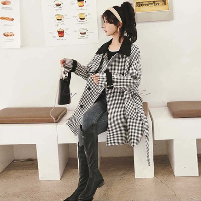モノトーンの千鳥格子柄にブラックの襟とベルトがドッキングしたモードなトレンチコート。