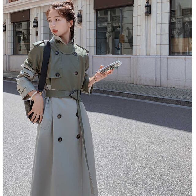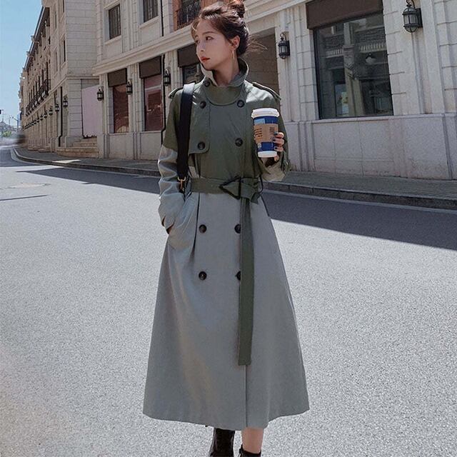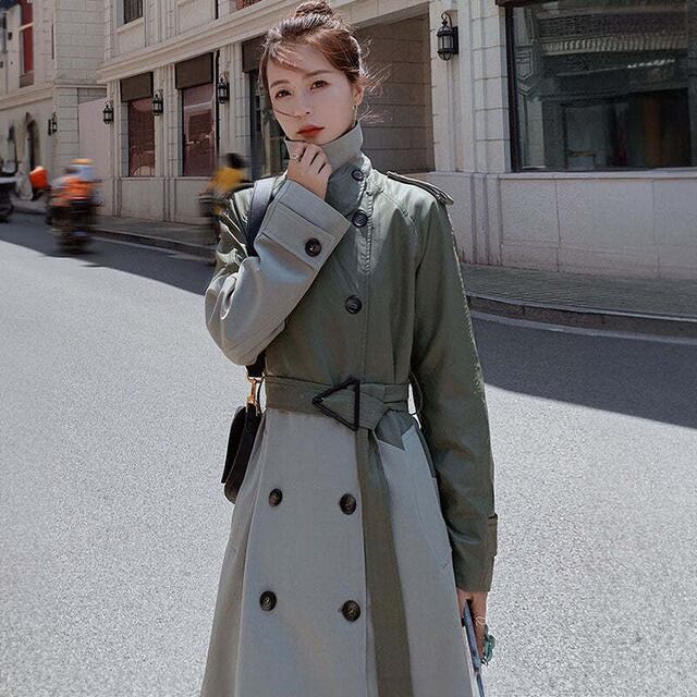 カーキのレザーとベージュのファブリックがドッキングしたロングトレンチコート。