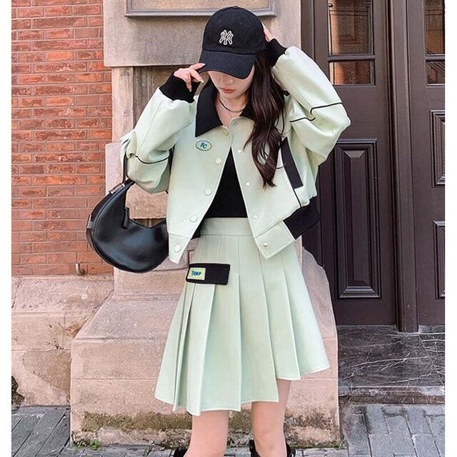 バイカラー襟付きブルゾン×イレヘムプリーツミニスカート ツービースセット(2COLORS)