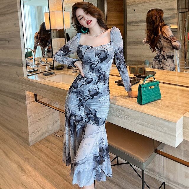 ウォーターカラープリントマーメイドワンピース