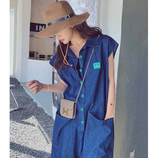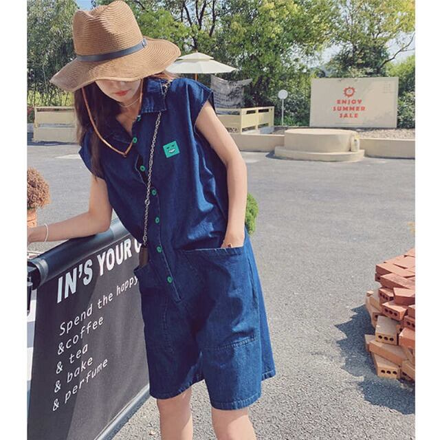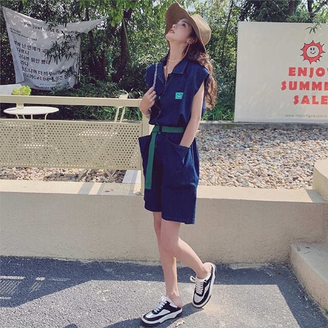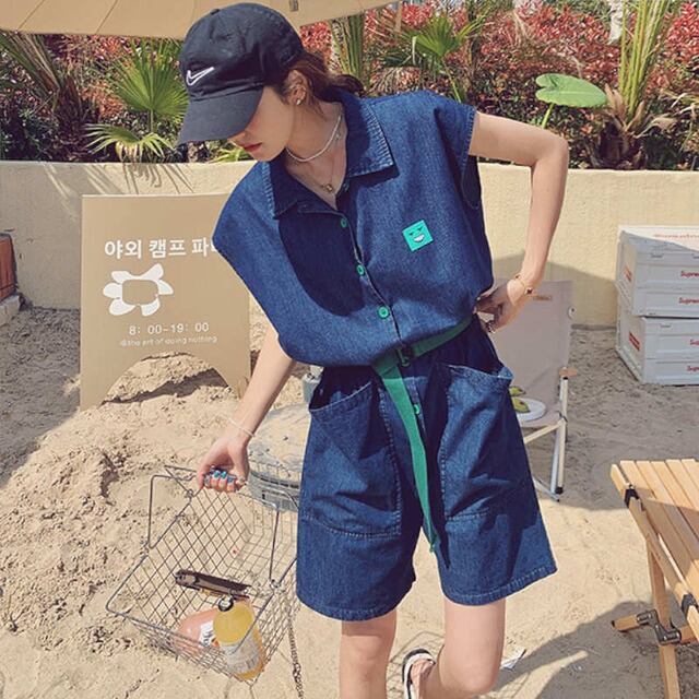 フェイスパッチ付きデニムシャツオールインワンショートパンツ