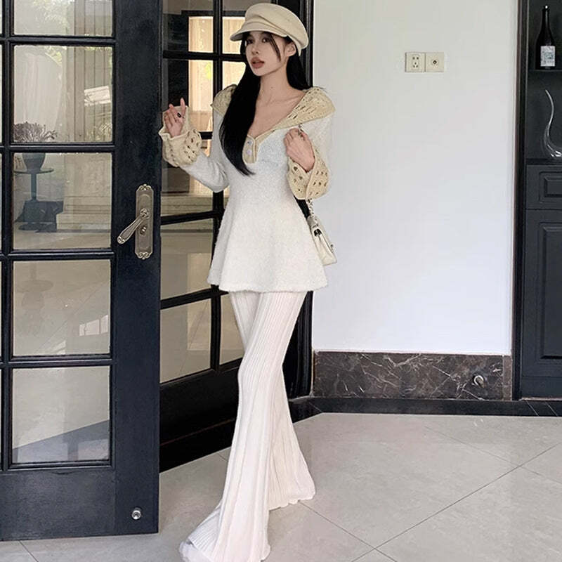 襟と袖口をざっくりと編んだ、レトロな雰囲気のニットセットアップ。