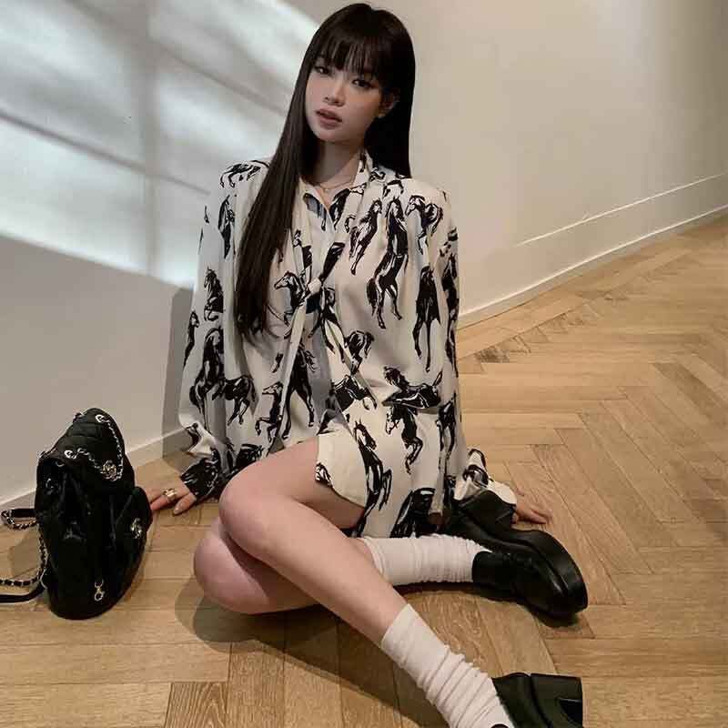 ホースプリントリボンタイブラウス