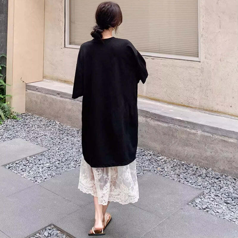 ビッグシルエットのTシャツワンピースにレーススカートを重ねる。