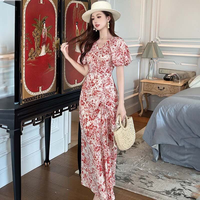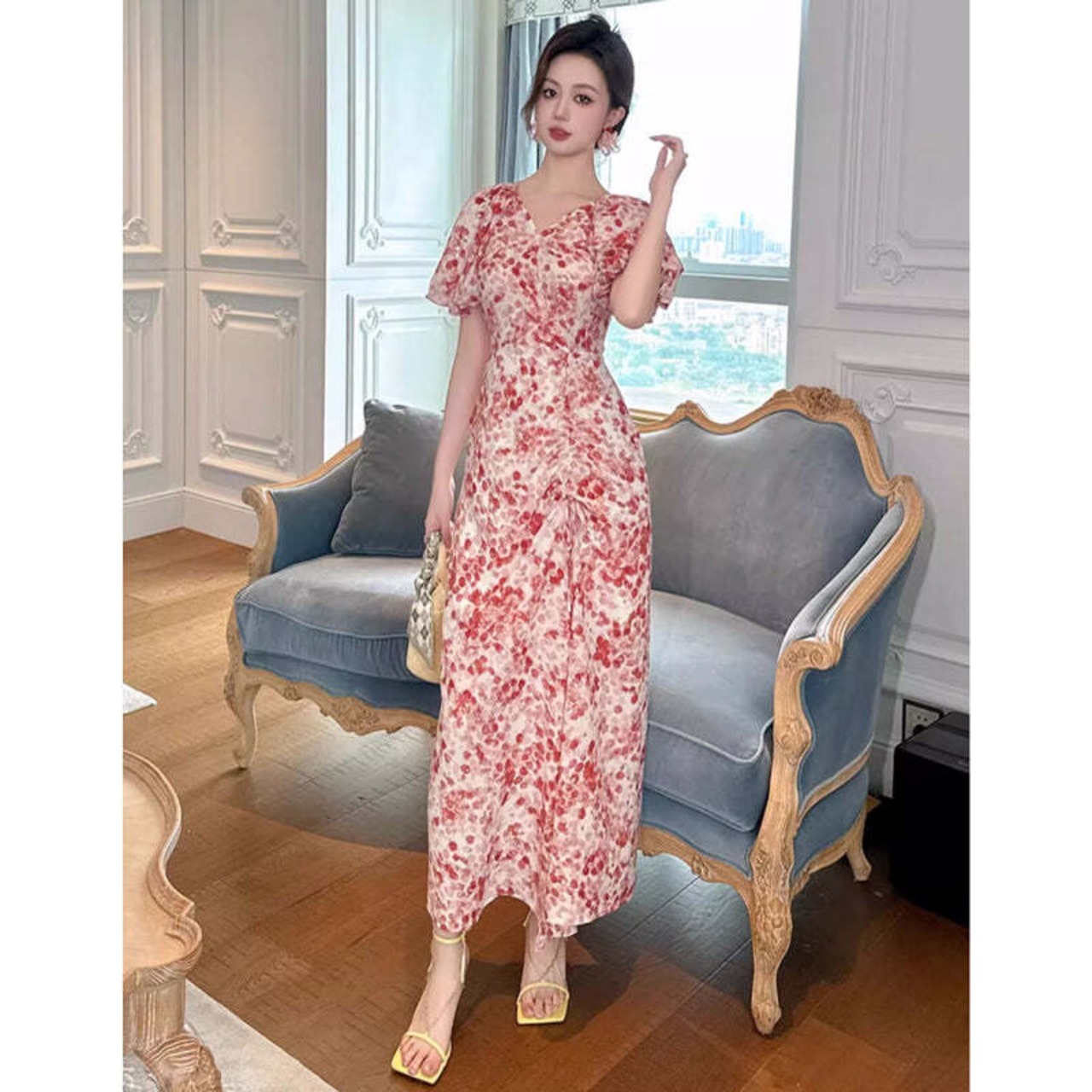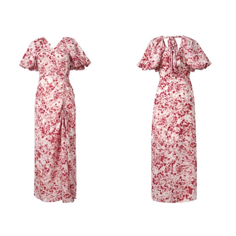 すっきりとした深いVネックラインとふんわりと丸みを帯びた袖が、まるでプリンセスのようなドレス。