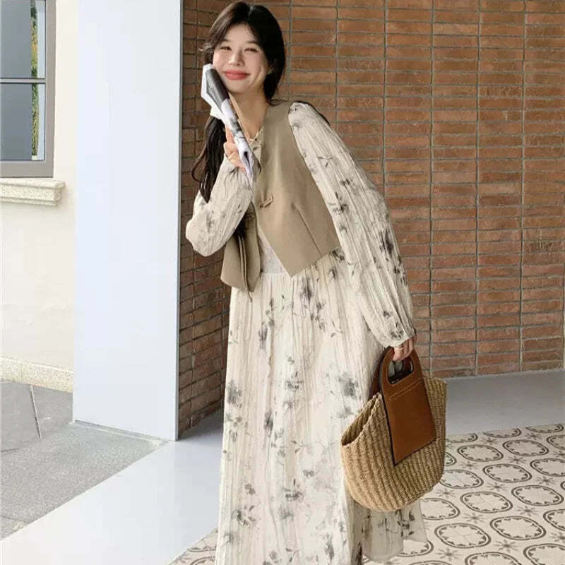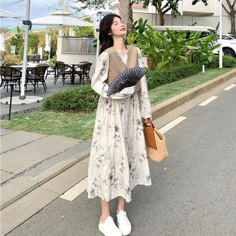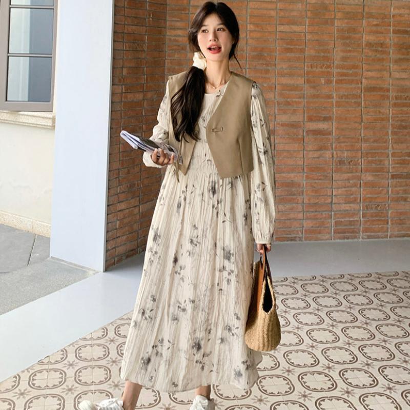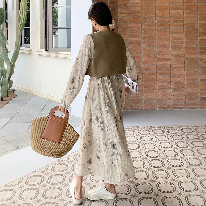 チャイナ風ベスト×花柄シャーリングワンピース