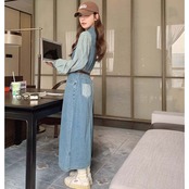 袖がストライプのデニム素材のカジュアルワンピース。